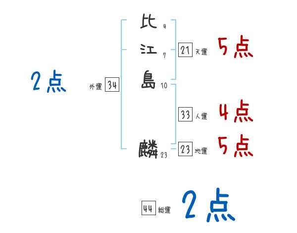 総運![]() | 比江島麟さんの総運は44画の2つ星!誠実で慎重な性格。物事を考えすぎないように注意しましょう。 あなたの人生を表す1番重要な運勢です。生涯を通じて影響する総合運となり、主に50歳以降の晩年期に影響を及ぼします。 |