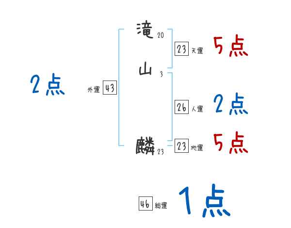 天運![]() | 滝山麟さんの天運は23画の5つ星!想像力に優れ活力がある。一代で成功し名誉を手に入れる。 家系が持つ宿命的な運勢を表します。祖先から受け継いだ苗字ですので自分の力が及びません。家柄を象徴します。 |