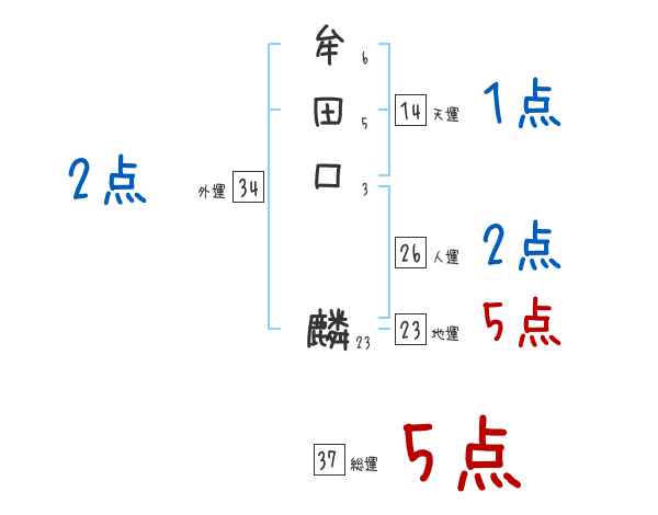 総運![]() | 牟田口麟さんの総運は37画の5つ星!努力家で順応性に優れる。現実的な考え方ができ忠実に物事をこなす。 あなたの人生を表す1番重要な運勢です。生涯を通じて影響する総合運となり、主に50歳以降の晩年期に影響を及ぼします。 |