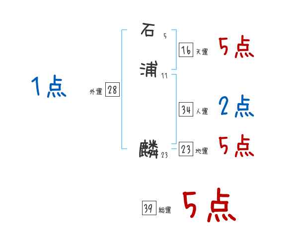総運![]() | 石浦麟さんの総運は39画の5つ星!社交性に優れ人望が厚い。人の上に立ち成功する。 あなたの人生を表す1番重要な運勢です。生涯を通じて影響する総合運となり、主に50歳以降の晩年期に影響を及ぼします。 |