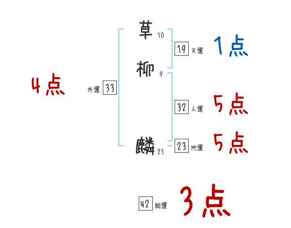 天運![]() | 草柳麟さんの天運は19画の1つ星!優れた才能を持ちますが、協調性が足りないことも。周りの人と協力する事を意識しましょう。 家系が持つ宿命的な運勢を表します。祖先から受け継いだ苗字ですので自分の力が及びません。家柄を象徴します。 |