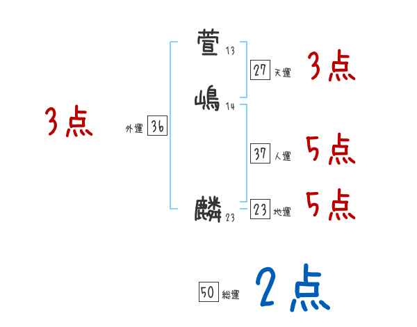 天運![]() | 萱嶋麟さんの天運は27画の3つ星!頭脳明晰だが強情で摩擦が多い傾向。孤立に注意。 家系が持つ宿命的な運勢を表します。祖先から受け継いだ苗字ですので自分の力が及びません。家柄を象徴します。 |