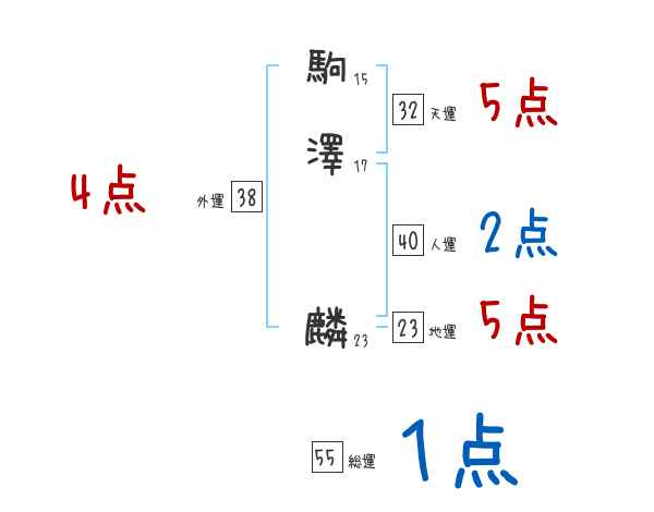 天運![]() | 駒澤麟さんの天運は32画の5つ星!柔軟性があり成功する。チャンスが多く金運が良い。 家系が持つ宿命的な運勢を表します。祖先から受け継いだ苗字ですので自分の力が及びません。家柄を象徴します。 |