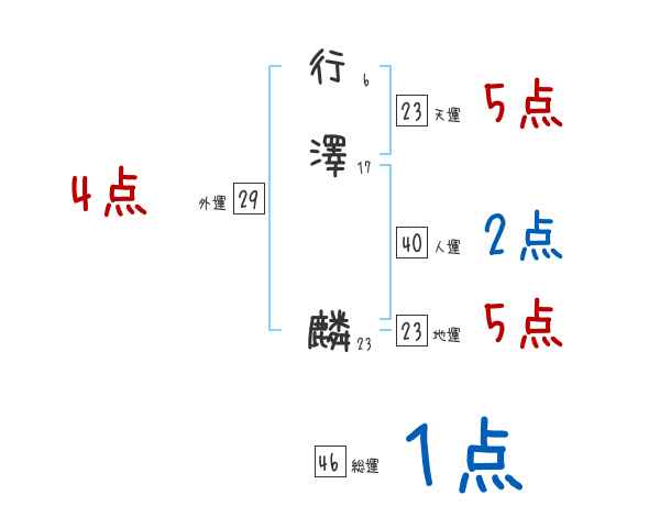 総運![]() | 行澤麟さんの総運は46画の1つ星!迷走することが多く苦労するかも。目先のことにとらわれないように。 あなたの人生を表す1番重要な運勢です。生涯を通じて影響する総合運となり、主に50歳以降の晩年期に影響を及ぼします。 |