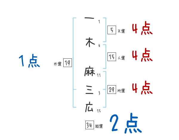 天運![]() | 一木麻三広さんの天運は5画の4つ星!健康で安泰。協調性に優れ、財産に恵まれる。 家系が持つ宿命的な運勢を表します。祖先から受け継いだ苗字ですので自分の力が及びません。家柄を象徴します。 |