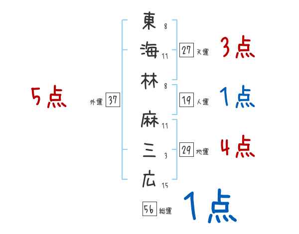 総運![]() | 東海林麻三広さんの総運は56画の1つ星!消極的で無気力になりがち。誠実な気持ちが必要でしょう。 あなたの人生を表す1番重要な運勢です。生涯を通じて影響する総合運となり、主に50歳以降の晩年期に影響を及ぼします。 |