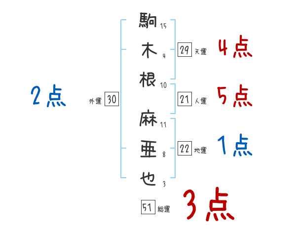 総運![]() | 駒木根麻亜也さんの総運は51画の3つ星!変化が激しく、危険に注意。堅実な性格。 あなたの人生を表す1番重要な運勢です。生涯を通じて影響する総合運となり、主に50歳以降の晩年期に影響を及ぼします。 |