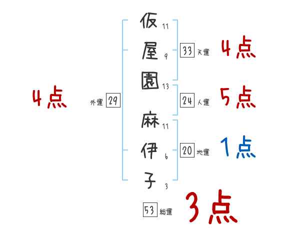 人運![]() | 仮屋園麻伊子さんの人運は24画の5つ星!家庭運が良く順調な人生。金運にも恵まれる。 性格や才能などを表す2番目に重要な運勢です。人間関係や協調性、社会的な成功に影響します。主に20歳から50歳ぐらいまでの中年期の運勢を表します。 |