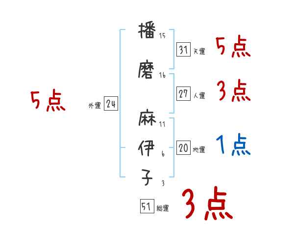 外運![]() | 播磨麻伊子さんの外運は24画の5つ星!家庭運が良く順調な人生。金運にも恵まれる。 生活面を象徴する運勢です。外部から受ける影響力を表し、結婚運、家庭運や職場、環境への順応性を表します。 |