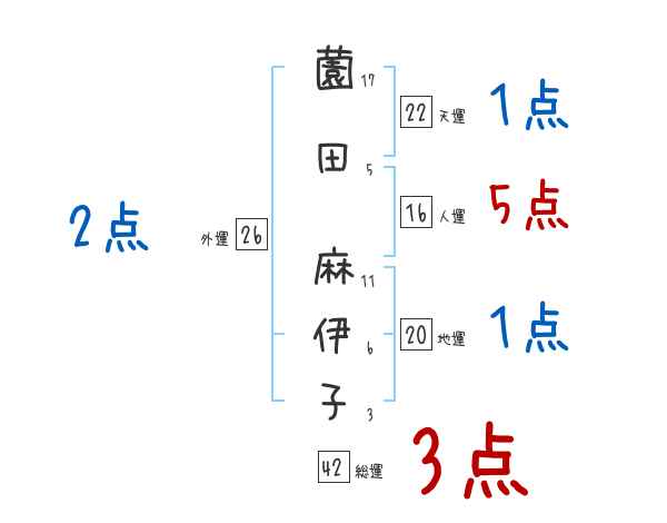 | 天運  | 薗田麻伊子さんの天運は22画の1つ星!努力することが苦手ないっぽう手先が器用。芸術性にも優れる。家系が持つ宿命的な運勢を表します。祖先から受け継いだ苗字ですので自分の力が及びません。家柄を象徴します。 |