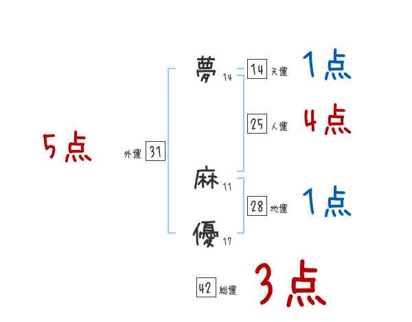 外運![]() | 夢麻優さんの外運は31画の5つ星!社交性があり判断力に優れる。順風満帆な人生で円満な生活。 生活面を象徴する運勢です。外部から受ける影響力を表し、結婚運、家庭運や職場、環境への順応性を表します。 |