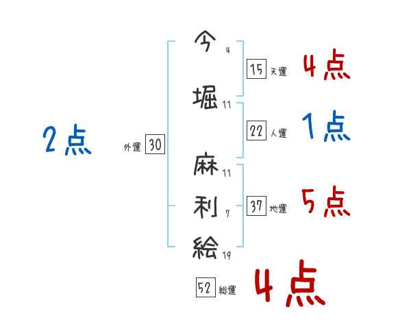 外運![]() | 今堀麻利絵さんの外運は30画の2つ星!浮き沈みの激しさに注意しましょう。 生活面を象徴する運勢です。外部から受ける影響力を表し、結婚運、家庭運や職場、環境への順応性を表します。 |