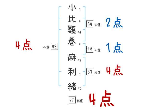 総運![]() | 小比類巻麻利緒さんの総運は67画の4つ星!幸運な人生。堅実な性格で調和し、周りの人に助けられる。 あなたの人生を表す1番重要な運勢です。生涯を通じて影響する総合運となり、主に50歳以降の晩年期に影響を及ぼします。 |