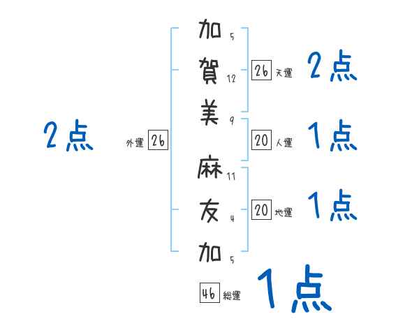 天運![]()  | 加賀美麻友加さんの天運は26画の2つ星!波瀾万丈かも。信頼できる人を大事にしましょう。 家系が持つ宿命的な運勢を表します。祖先から受け継いだ苗字ですので自分の力が及びません。家柄を象徴します。 |