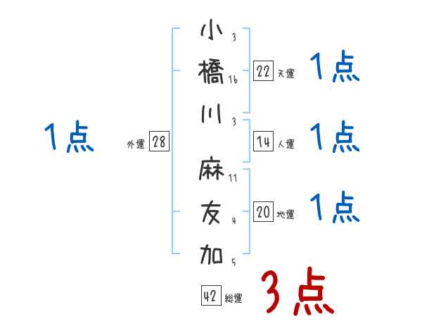 総運![]() | 小橋川麻友加さんの総運は42画の3つ星!病気に注意。多芸であるが消極的でおとなしい。 あなたの人生を表す1番重要な運勢です。生涯を通じて影響する総合運となり、主に50歳以降の晩年期に影響を及ぼします。 |
