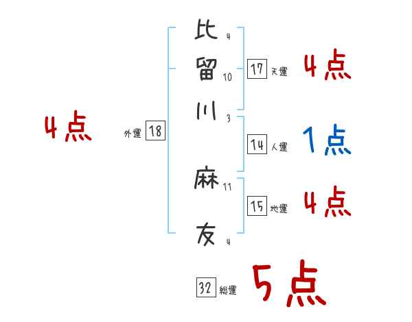総運![]() | 比留川麻友さんの総運は32画の5つ星!柔軟性があり成功する。チャンスが多く金運が良い。 あなたの人生を表す1番重要な運勢です。生涯を通じて影響する総合運となり、主に50歳以降の晩年期に影響を及ぼします。 |