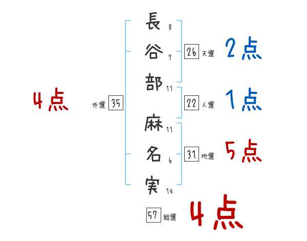 天運![]() | 長谷部麻名実さんの天運は26画の2つ星!波瀾万丈かも。信頼できる人を大事にしましょう。 家系が持つ宿命的な運勢を表します。祖先から受け継いだ苗字ですので自分の力が及びません。家柄を象徴します。 |