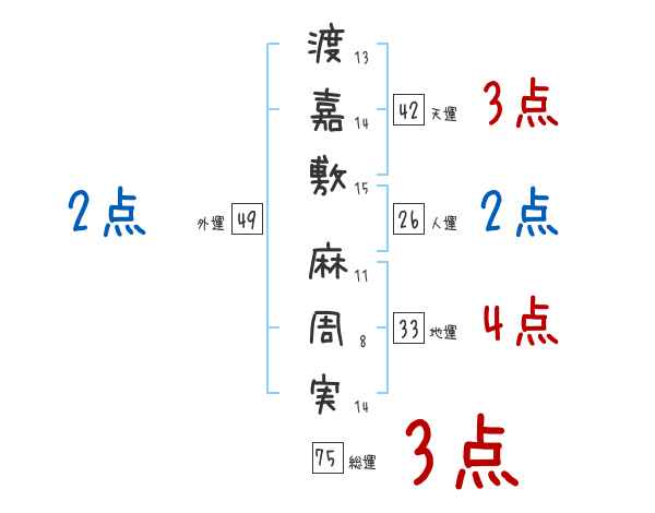 人運![]() | 渡嘉敷麻周実さんの人運は26画の2つ星!波瀾万丈かも。信頼できる人を大事にしましょう。 性格や才能などを表す2番目に重要な運勢です。人間関係や協調性、社会的な成功に影響します。主に20歳から50歳ぐらいまでの中年期の運勢を表します。 |