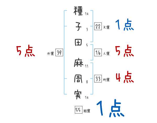 外運![]() | 種子田麻周実さんの外運は39画の5つ星!社交性に優れ人望が厚い。人の上に立ち成功する。 生活面を象徴する運勢です。外部から受ける影響力を表し、結婚運、家庭運や職場、環境への順応性を表します。 |