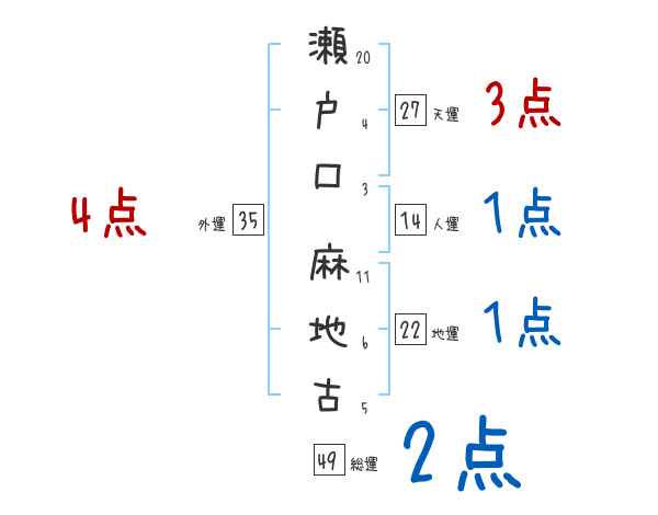 外運![]() | 瀬戸口麻地古さんの外運は35画の4つ星!温厚な性格で感受性が高い。穏和な性格で人望が厚い。 生活面を象徴する運勢です。外部から受ける影響力を表し、結婚運、家庭運や職場、環境への順応性を表します。 |