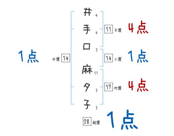 総運![]() | 井手口麻夕子さんの総運は28画の1つ星!家庭環境に注意。スポーツで活躍できる能力があるかも。 あなたの人生を表す1番重要な運勢です。生涯を通じて影響する総合運となり、主に50歳以降の晩年期に影響を及ぼします。 |