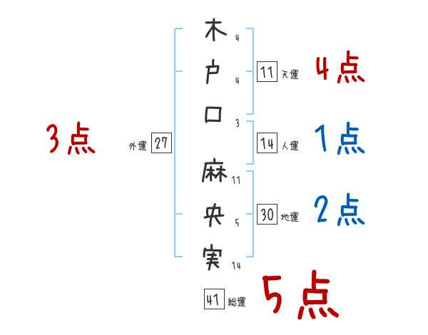外運![]() | 木戸口麻央実さんの外運は27画の3つ星!頭脳明晰だが強情で摩擦が多い傾向。孤立に注意。 生活面を象徴する運勢です。外部から受ける影響力を表し、結婚運、家庭運や職場、環境への順応性を表します。 |