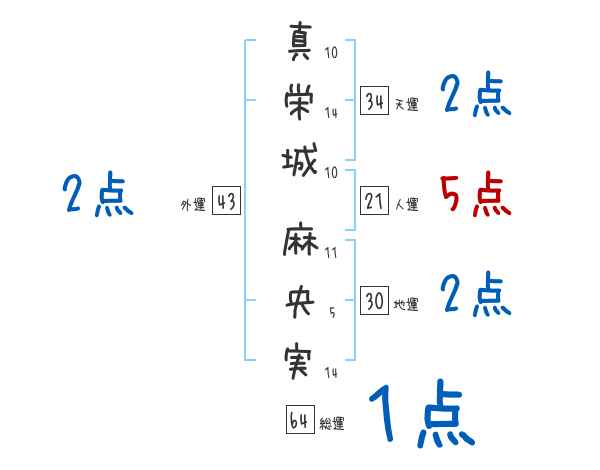 人運![]() | 真栄城麻央実さんの人運は21画の5つ星!統率力がある。独立し成功する。名誉を手に入れる。 性格や才能などを表す2番目に重要な運勢です。人間関係や協調性、社会的な成功に影響します。主に20歳から50歳ぐらいまでの中年期の運勢を表します。 |