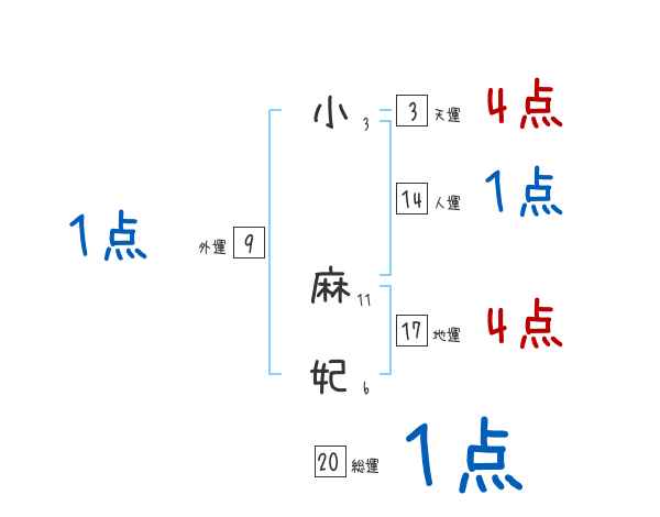 天運![]() | 小麻妃さんの天運は3画の4つ星!活動的で才能に恵まれ、多くの信頼を得る。希望に満ち成長する。 家系が持つ宿命的な運勢を表します。祖先から受け継いだ苗字ですので自分の力が及びません。家柄を象徴します。 |