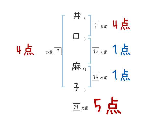 天運![]() | 井口麻子さんの天運は7画の4つ星!強い意志や信念を持ち独立心が強い。自立する。 家系が持つ宿命的な運勢を表します。祖先から受け継いだ苗字ですので自分の力が及びません。家柄を象徴します。 |