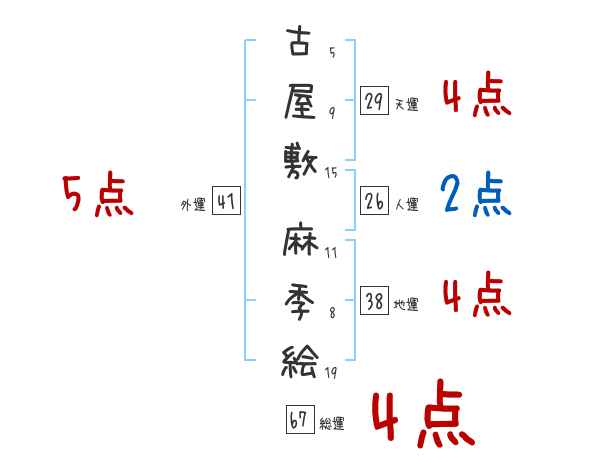 天運![]() | 古屋敷麻季絵さんの天運は29画の4つ星!完全主義で才能がある。厳格な心の持ち主。 家系が持つ宿命的な運勢を表します。祖先から受け継いだ苗字ですので自分の力が及びません。家柄を象徴します。 |