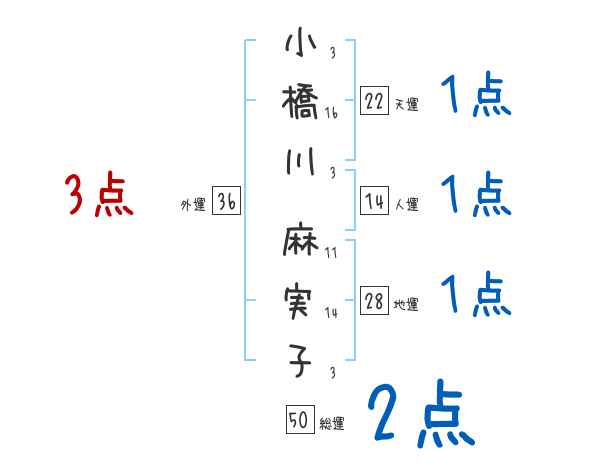 外運![]() | 小橋川麻実子さんの外運は36画の3つ星!先見性が豊かです。多少神経質で苦労することも。 生活面を象徴する運勢です。外部から受ける影響力を表し、結婚運、家庭運や職場、環境への順応性を表します。 |