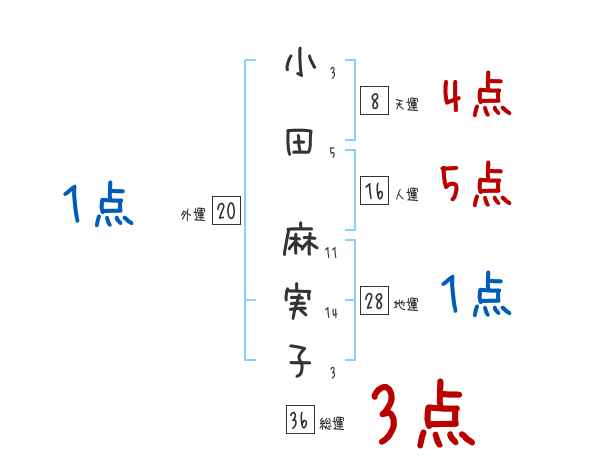 総運![]() | 小田麻実子さんの総運は36画の3つ星!先見性が豊かです。多少神経質で苦労することも。 あなたの人生を表す1番重要な運勢です。生涯を通じて影響する総合運となり、主に50歳以降の晩年期に影響を及ぼします。 |