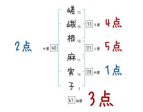 人運![]() | 嵯峨根麻実子さんの人運は21画の5つ星!統率力がある。独立し成功する。名誉を手に入れる。 性格や才能などを表す2番目に重要な運勢です。人間関係や協調性、社会的な成功に影響します。主に20歳から50歳ぐらいまでの中年期の運勢を表します。 |