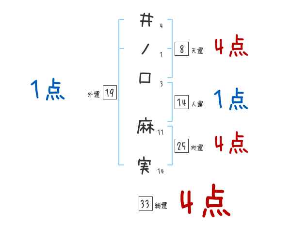 外運![]() | 井ノ口麻実さんの外運は19画の1つ星!優れた才能を持ちますが、協調性が足りないことも。周りの人と協力する事を意識しましょう。 生活面を象徴する運勢です。外部から受ける影響力を表し、結婚運、家庭運や職場、環境への順応性を表します。 |