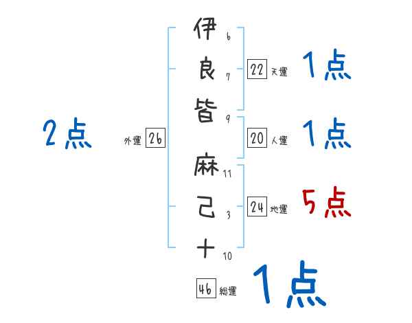 総運![]() | 伊良皆麻己十さんの総運は46画の1つ星!迷走することが多く苦労するかも。目先のことにとらわれないように。 あなたの人生を表す1番重要な運勢です。生涯を通じて影響する総合運となり、主に50歳以降の晩年期に影響を及ぼします。 |