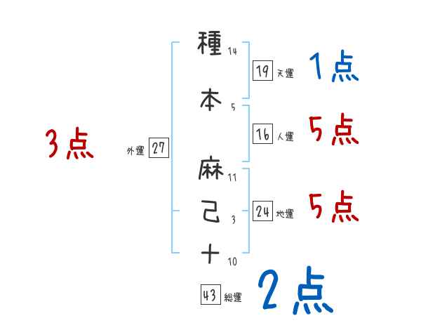 総運![]() | 種本麻己十さんの総運は43画の2つ星!頑固な性格で独立心が強いかも。やや非現実的で浪費に注意しましょう。 あなたの人生を表す1番重要な運勢です。生涯を通じて影響する総合運となり、主に50歳以降の晩年期に影響を及ぼします。 |