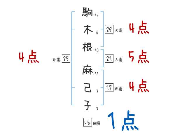 総運![]() | 駒木根麻己子さんの総運は46画の1つ星!迷走することが多く苦労するかも。目先のことにとらわれないように。 あなたの人生を表す1番重要な運勢です。生涯を通じて影響する総合運となり、主に50歳以降の晩年期に影響を及ぼします。 |