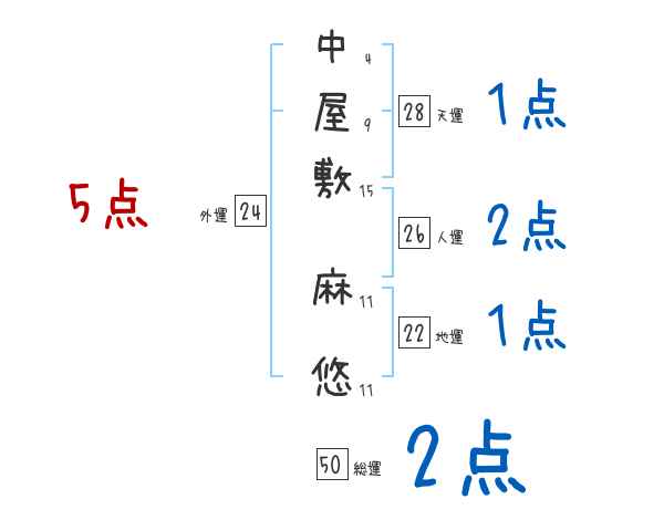 外運![]() | 中屋敷麻悠さんの外運は24画の5つ星!家庭運が良く順調な人生。金運にも恵まれる。 生活面を象徴する運勢です。外部から受ける影響力を表し、結婚運、家庭運や職場、環境への順応性を表します。 |