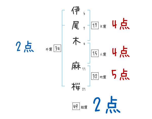 人運![]() | 伊尾木麻桜さんの人運は15画の4つ星!人徳があり出世する。順調に物事を進め円満な人生。 性格や才能などを表す2番目に重要な運勢です。人間関係や協調性、社会的な成功に影響します。主に20歳から50歳ぐらいまでの中年期の運勢を表します。 |