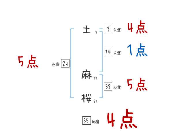 天運![]() | 土麻桜さんの天運は3画の4つ星!活動的で才能に恵まれ、多くの信頼を得る。希望に満ち成長する。 家系が持つ宿命的な運勢を表します。祖先から受け継いだ苗字ですので自分の力が及びません。家柄を象徴します。 |
