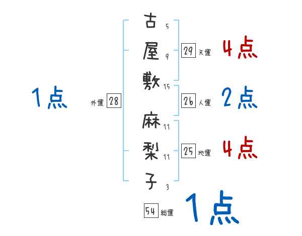 天運![]() | 古屋敷麻梨子さんの天運は29画の4つ星!完全主義で才能がある。厳格な心の持ち主。 家系が持つ宿命的な運勢を表します。祖先から受け継いだ苗字ですので自分の力が及びません。家柄を象徴します。 |
