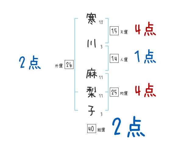 外運![]() | 寒川麻梨子さんの外運は26画の2つ星!波瀾万丈かも。信頼できる人を大事にしましょう。 生活面を象徴する運勢です。外部から受ける影響力を表し、結婚運、家庭運や職場、環境への順応性を表します。 |