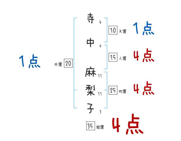 人運![]() | 寺中麻梨子さんの人運は15画の4つ星!人徳があり出世する。順調に物事を進め円満な人生。 性格や才能などを表す2番目に重要な運勢です。人間関係や協調性、社会的な成功に影響します。主に20歳から50歳ぐらいまでの中年期の運勢を表します。 |
