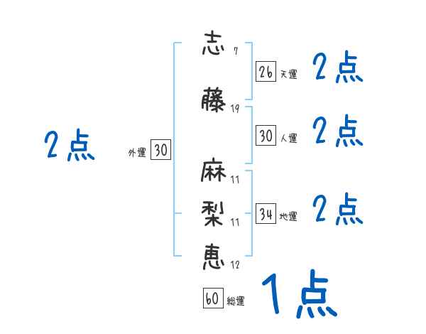 総運![]() | 志藤麻梨恵さんの総運は60画の1つ星!悲観的で迷いやすい。波乱が多く損をしないように。 あなたの人生を表す1番重要な運勢です。生涯を通じて影響する総合運となり、主に50歳以降の晩年期に影響を及ぼします。 |