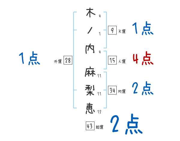 総運![]() | 木ノ内麻梨恵さんの総運は43画の2つ星!頑固な性格で独立心が強いかも。やや非現実的で浪費に注意しましょう。 あなたの人生を表す1番重要な運勢です。生涯を通じて影響する総合運となり、主に50歳以降の晩年期に影響を及ぼします。 |