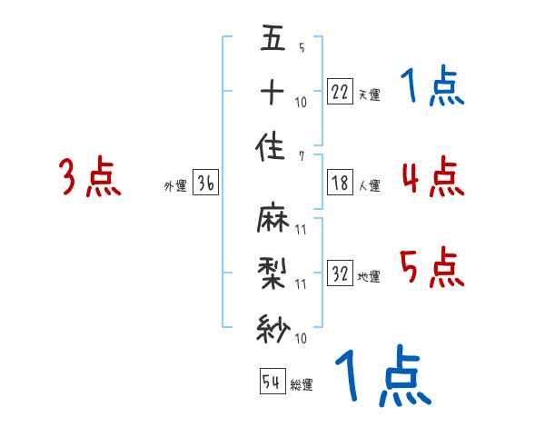 外運![]() | 五十住麻梨紗さんの外運は36画の3つ星!先見性が豊かです。多少神経質で苦労することも。 生活面を象徴する運勢です。外部から受ける影響力を表し、結婚運、家庭運や職場、環境への順応性を表します。 |