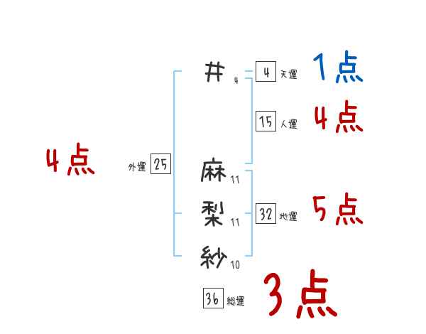 天運![]() | 井麻梨紗さんの天運は4画の1つ星!感情が不安定で苦労するかも。周囲との協調を心掛けましょう。 家系が持つ宿命的な運勢を表します。祖先から受け継いだ苗字ですので自分の力が及びません。家柄を象徴します。 |