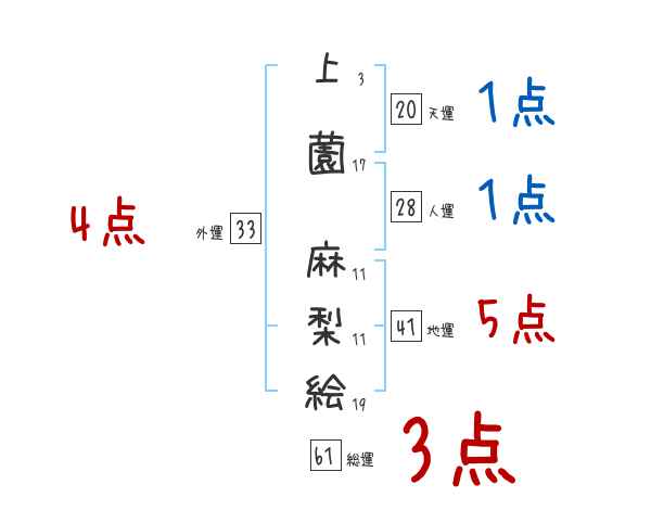 外運![]() | 上薗麻梨絵さんの外運は33画の4つ星!権力志向でプライドが高い。勇気があり運を切り開き成功する。 生活面を象徴する運勢です。外部から受ける影響力を表し、結婚運、家庭運や職場、環境への順応性を表します。 |
