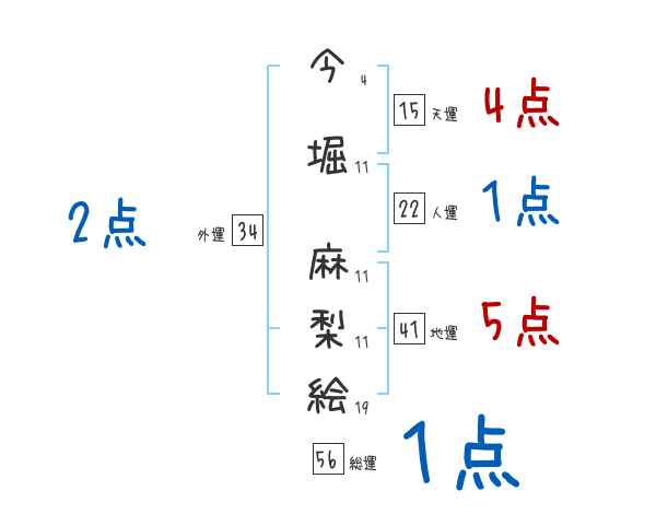 外運![]() | 今堀麻梨絵さんの外運は34画の2つ星!独創性に優れるが、自尊心が強く災難に注意しましょう。 生活面を象徴する運勢です。外部から受ける影響力を表し、結婚運、家庭運や職場、環境への順応性を表します。 |