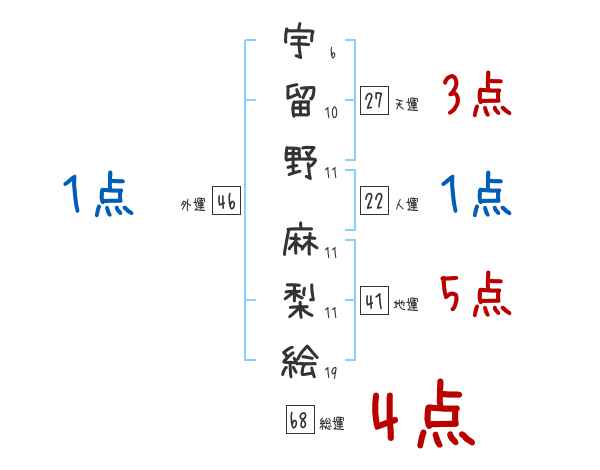 天運![]() | 宇留野麻梨絵さんの天運は27画の3つ星!頭脳明晰だが強情で摩擦が多い傾向。孤立に注意。 家系が持つ宿命的な運勢を表します。祖先から受け継いだ苗字ですので自分の力が及びません。家柄を象徴します。 |